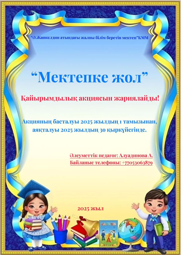Жүрегі мейірімге толы жомарт жандарды «Мектепке жол» акциясына үлес қосуға шақырамыз! «Ә. Жанкелдин атындағы жалпы білім беретін мектеп»КММ-сі , Әлеуметтік жағынан аз қамтылған отбасы балаларын қолдау мақсатында дәстүрге айналған «Мектепке жол» республикалық акциясы биылғы оқу жылында да «Жақсылықты жаса» айдарымен өткізілуде. Акцияның мақсаты: Мектеп оқушыларын толық оқумен қамту, аз қамтылған отбасы және көпбалалы отбасы балаларына қолдау көрсету, балалардың мектепке келмей қалуынан алдын алу, жетім және ата-ана қамқорлығынысыз қалған балалараға, тұрмысы төмен отбасы балаларына нақты көмек көрсету болып табылады. Акция осы жылдың 1 тамызы мен 30 қыркүйек аралығында өтеді. Акцияға белсене атсалысайық!
